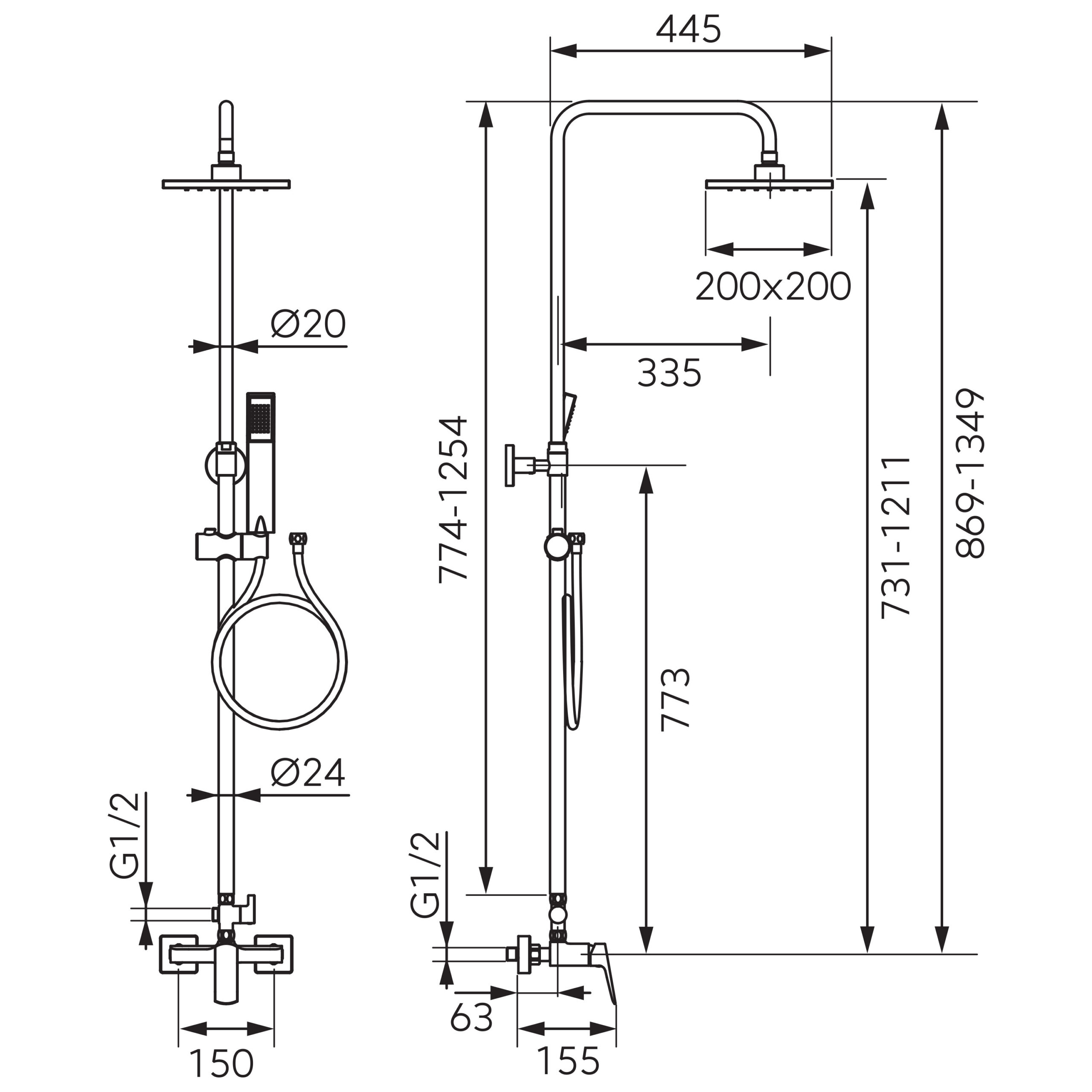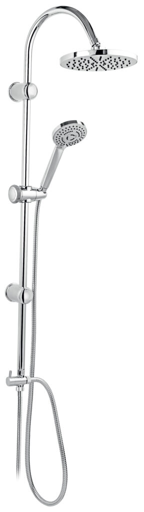 Sistem vključuje veliko nadglavno prho dimenzije 200 × 200 mm, ki ustvarja prijeten učinek dežnega pršenja za udobno in sproščujoče tuširanje. Kot prhe je nastavljiv s pomočjo krogličnega zgloba, kar omogoča optimalno prilagoditev smeri vodnega toka.